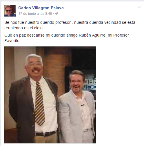 “Se nos fue nuestro querido profesor, nuestra querida vecindad se está reuniendo en el cielo. Que en paz descanse, mi querido amigo Rubén Aguirre, mi profesor favorito”, escribióCarlos Villagrán en la citada red social.